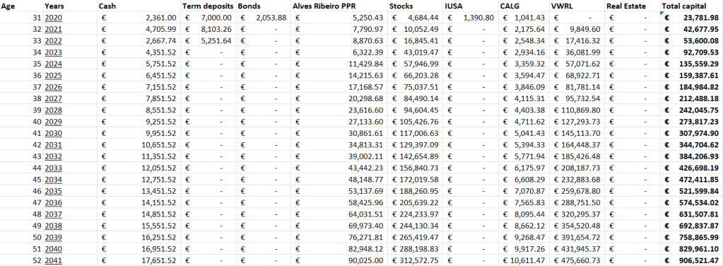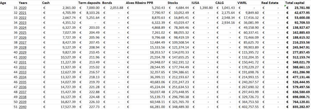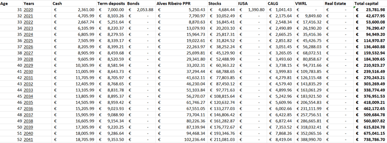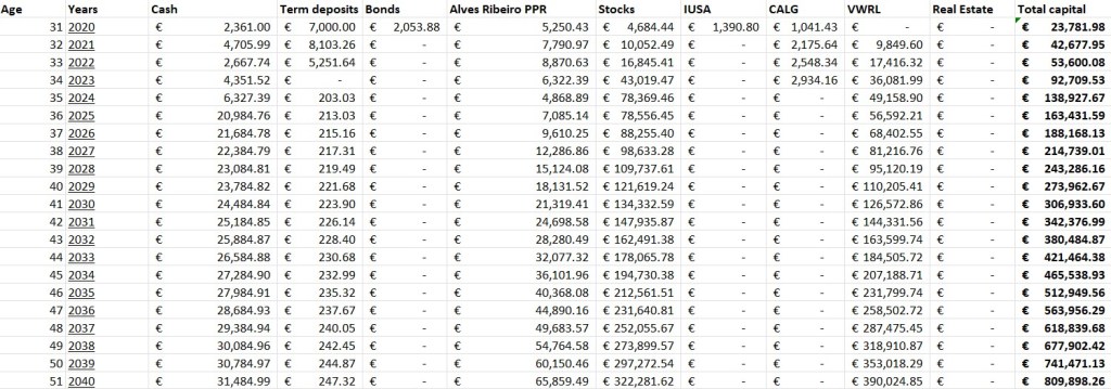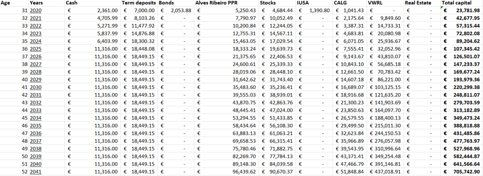 In this final section, a brief expectation about the future of the portfolio is presented. As mentioned earlier, the portfolio has reached a value of approximately €42,000. Assuming the materialization of the expected return presented before for the portfolio value, it will reach the value of €705,000 in 2041.