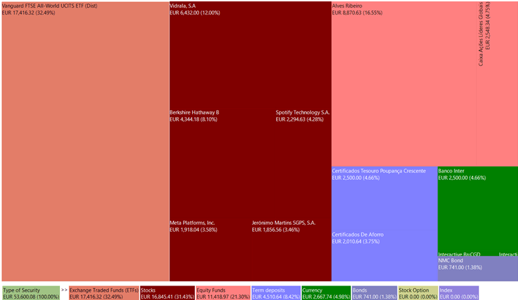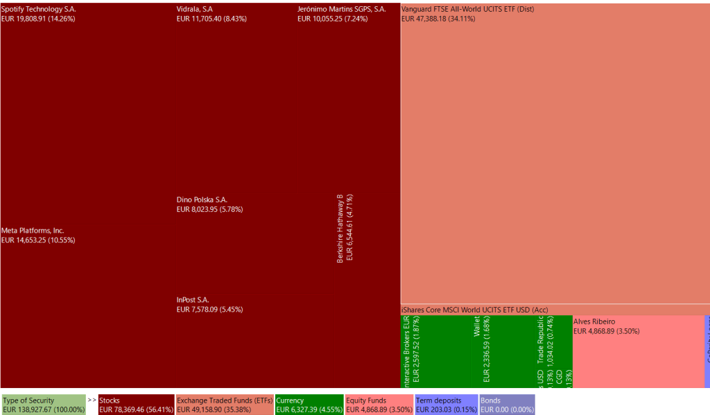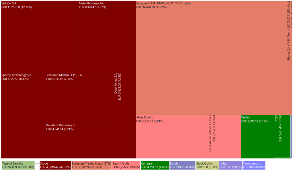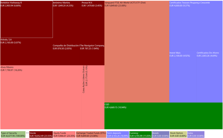 The portfolio’s expected return is 5.77% pa (gross value) and 4.05% pa (net value). The estimation approach varies by asset group. For global equity ETFs and equity funds, the expected return is based on the historical performance of the fund’s benchmarks. As no benchmark was found for ‘PPR Alves Ribeiro,’ belonging to the bond and equity fund group, the average returns over the last five years were utilized. The expected return for individually selected stocks was calculated at the time of purchase, bearing in mind its susceptibility to analysis errors. I intend to enhance net expected returns by reducing the percentage of cash in the portfolio and minimizing failures in stock selection.